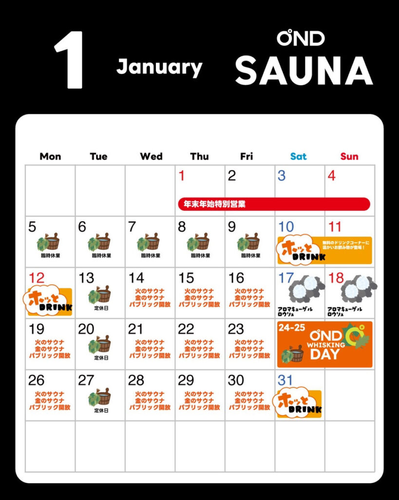 いつも当施設をご利用いただき、誠にありがとうございます。1月のイベントについて、ご案内いたします。・ 1/10(土)・11(日)・12(月)・31(土) ホットドリンクサービス・ 1/17(土)・18(日) アロマキューゲルロウリュサービス ・ 1/24(土)・25(日) OND WISKING DAYその他日程は、下記カレンダーにてご確認の上、ご予約・ご来館ください。皆さまのご来館を心よりお待ちしております。