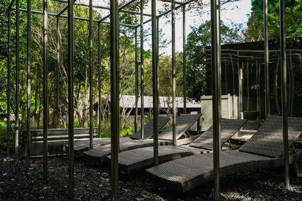 水のサウナは、「受容」をテーマに、水のフィルターを通して森の姿を映し出し、自然と一体となる感覚を味わえる空間として構想されています。